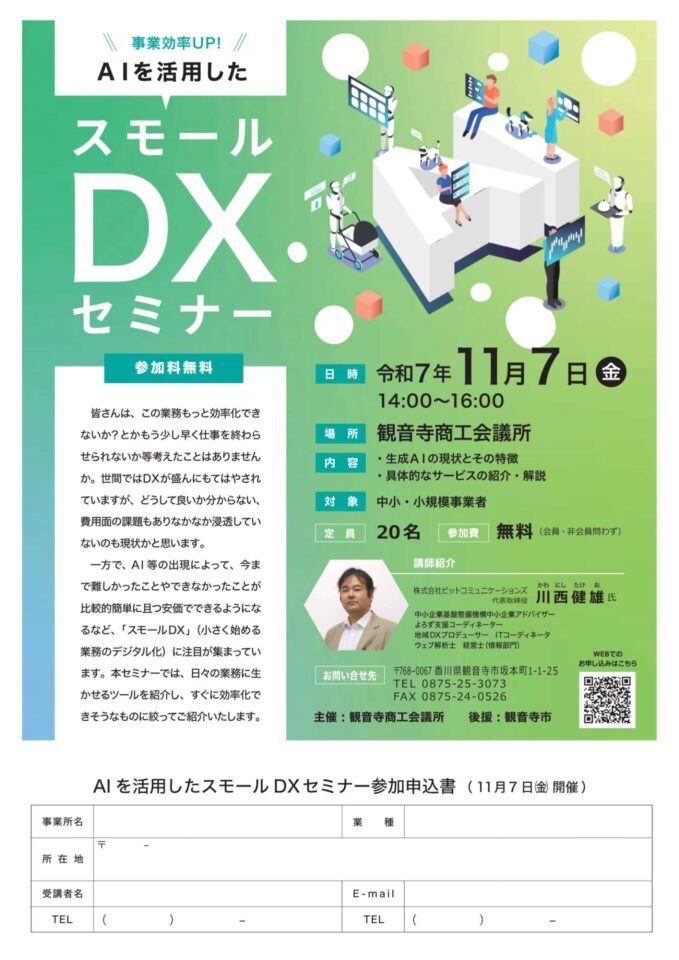 スモールDXセミナー 更新日 2025年12月30日 投稿日 2025年11月7日 著者 bit-com カテゴリー セミナー情報 日時:令和7年11月7日 14:00~16:00場所:観音寺商工会議所内容 生成AIの現状とその特徴