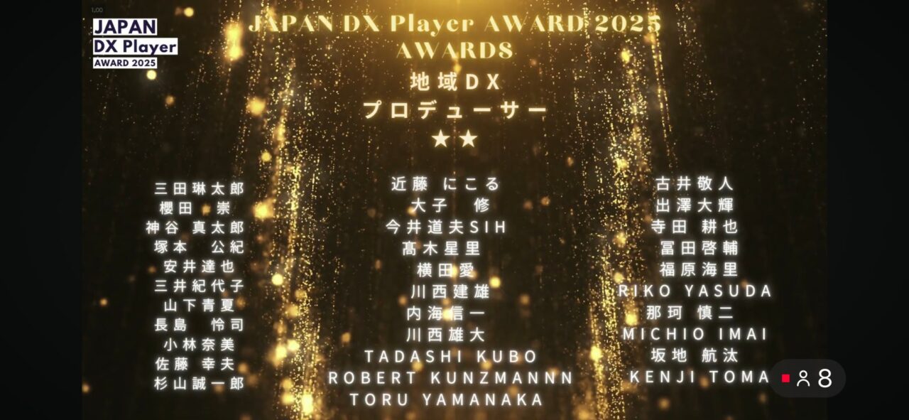 地域DXプロデューサー★★2025 更新日 2025年12月30日 投稿日 2025年11月29日 著者 bit-com カテゴリー お知らせ 本日東京で開催されたJAPAN DX Player AWARD 2025。 民間部門で特別賞をいただきました。関係者の皆さま、ありがとうございました。 また同会場にて、地域DXプロデューサー★★の表彰式もあり、弊社からも3名仲間に入れていただきました。