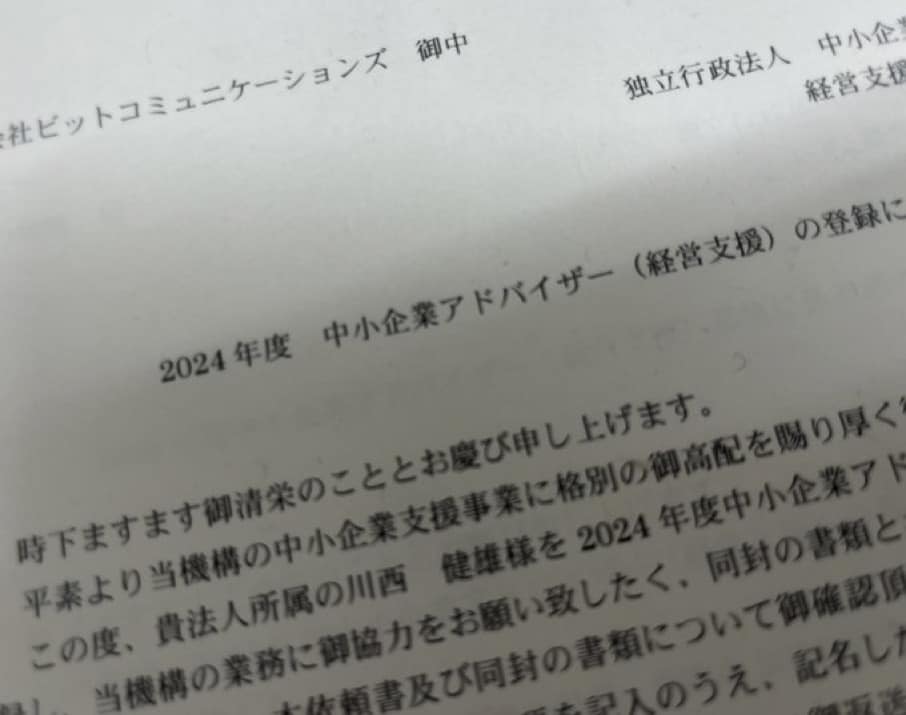 独立行政法人中小企業基盤整備機構の中小企業アドバイザー(経営支援)に登録いただきました。
